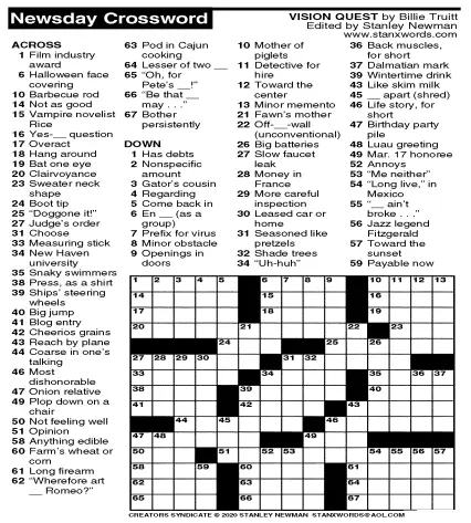 Newsday Crossword Puzzle Answers - Newsday reveals a new puzzle every day and they are of course free to play, you simply have to wait for the ads to load.. If you are done with the july 22 2021 newsday crossword puzzle and are looking for older puzzles then we recommend you to visit the archive page. Newsday crossword answers july 1 2021 were just recently published entirely solved for our dear readers. This monday's puzzle was created by gail grabowski, edited by stanley newman and the puzzle grid is 15 by 15 wide. We have changed the way we posting answers and solutions for clues; The idea why we share the answers online is that many people can't solve them and we are here to.